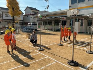 その後は、園庭に出て、ミニ信号機などを使って実際に横断歩道を渡る練習をしました。