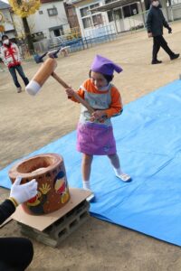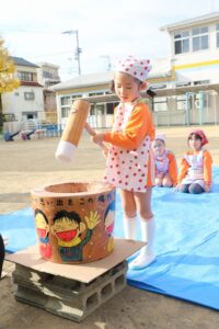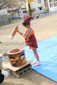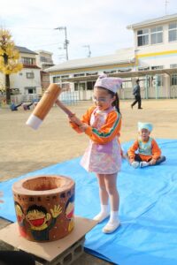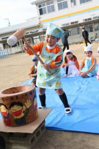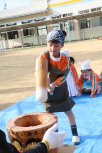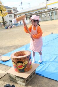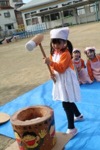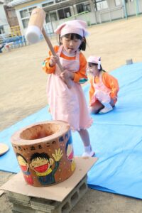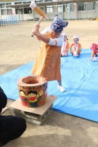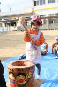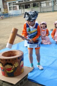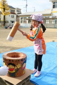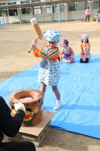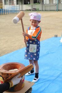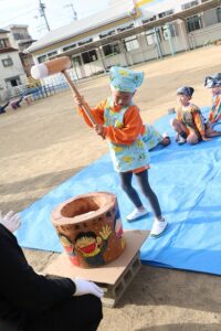かなり肌寒かったですが、頑張って、杵を持っておもちをつくことができました。