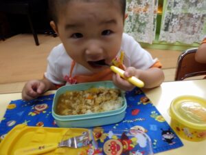 みんな大好きなカレー。みんなで収穫したタマネギやジャガイモを使って、ばら組さんが野菜を切ってくれ、ばら組さんの保護者の方々がカレーを作ってくれました!