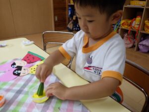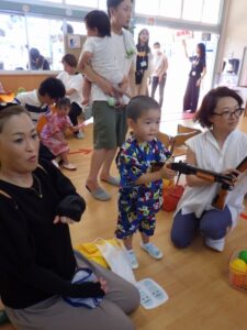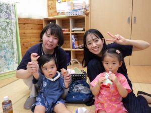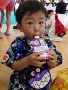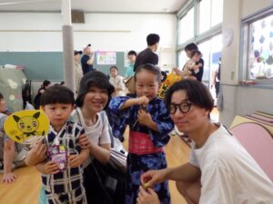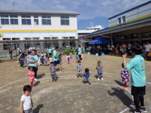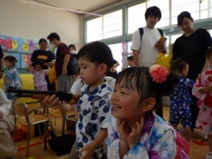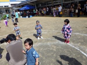 園庭では盆踊りを踊りましたが…大勢のお客さんと暑さ、恥ずかしさ諸々…で少し緊張していた子ども達でしたね。