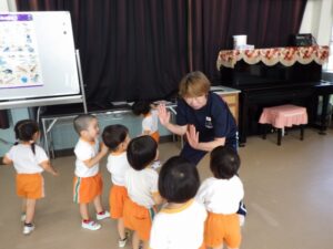 「Goodmorning!」と挨拶をして、早速、歌を歌って楽しみます。