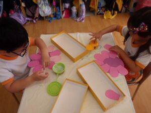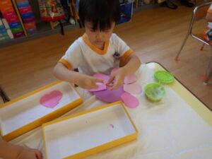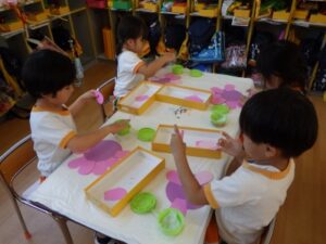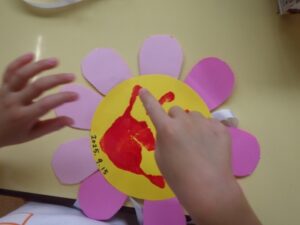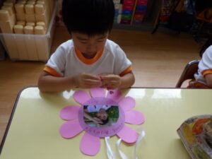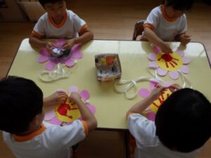 15日(火)は敬老の日ですね。大好きなおじいちゃん、おばあちゃんに、手形のペンダントのプレゼント作りをしました。