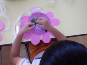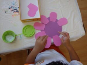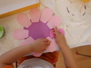 コスモスの花びらに見立てた、ピンクと薄ピンクの色画用紙を貼って…