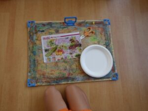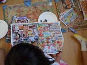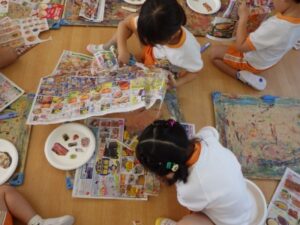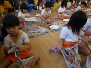 今週の造形では、食べ物の載っている広告紙をハサミで切りました。