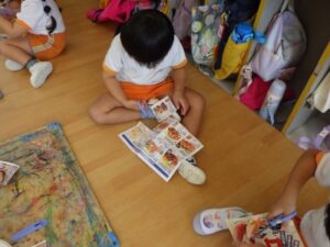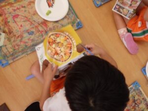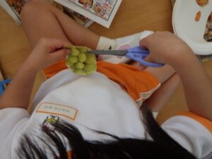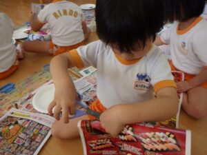 「お肉があるー」「私、マスカットにする」「見て見て、お寿司―!」「ケーキにした!」等と自分の好きな食べ物を探し、ハサミでチョキチョキ…🎵中にはビールを切った子どもも…(笑)🍺