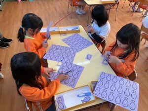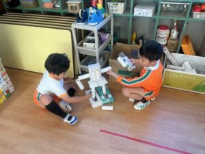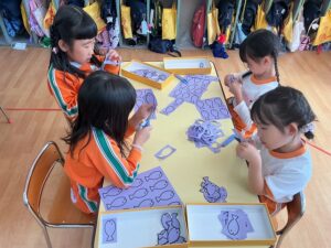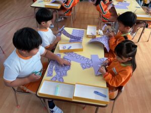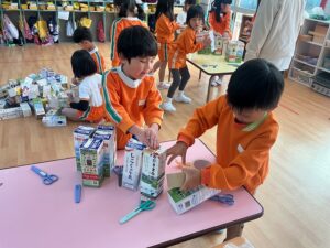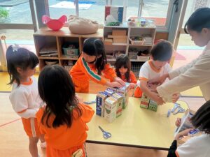 火曜日は、作品作り。共同作品のゾウを作るのに、牛乳パックを4つのかたまりにしていきました。