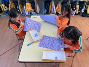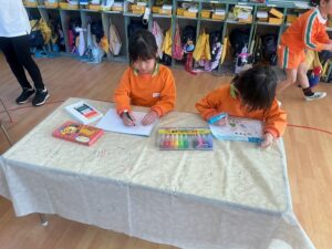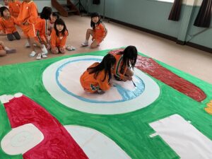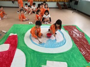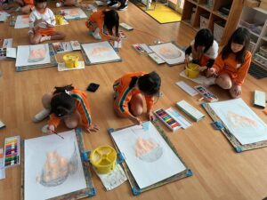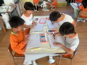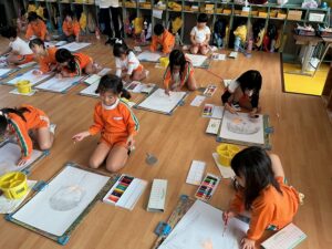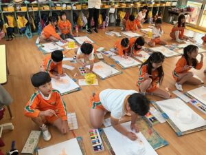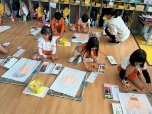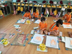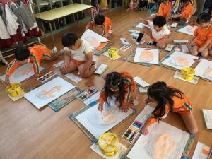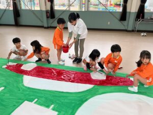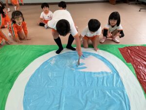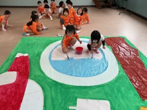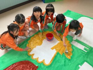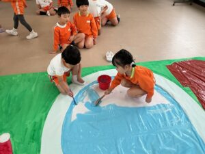 水曜日は、自画像の色塗りを仕上げた後、壁画制作をしました。子ども達には、絵の具で色を塗ってもらいました。
