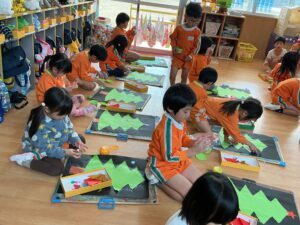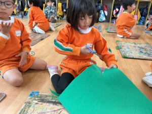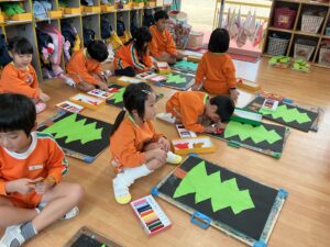 įˇ‘ã¨éģ„įˇ‘ãŽč‰˛į”ģį”¨į´™ãŽãŠãĄã‚‰ã‹ã‚’é¸ã‚“ã§ã€ãƒ„ãƒĒãƒŧぎåŊĸãĢįˇšã‚’ãƒã‚ĩミで切りぞした。
