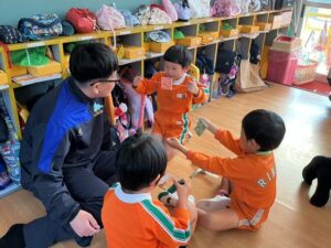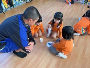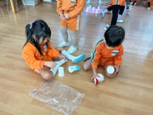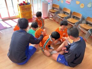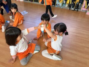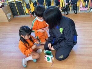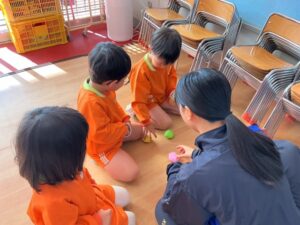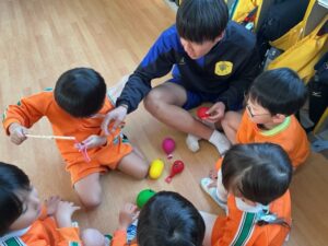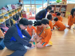 今週は、月曜日・火曜日・水曜日と3日連続で中学生が家庭科の授業で遊びに来てくれました。すっかりと慣れてきた子ども達は自分からお兄さんやお姉さんに寄って行き、すぐに遊び始めていました。