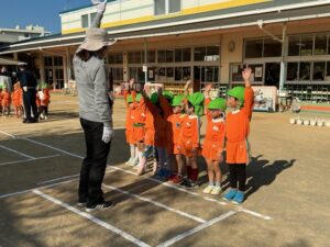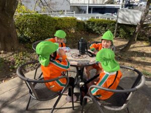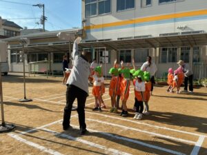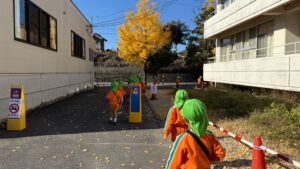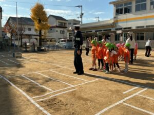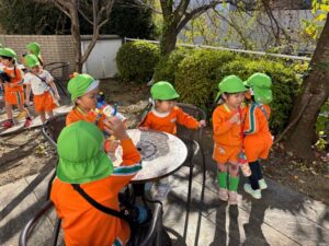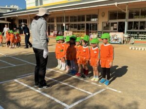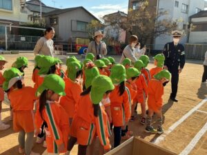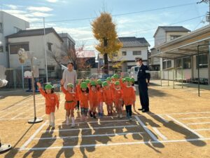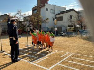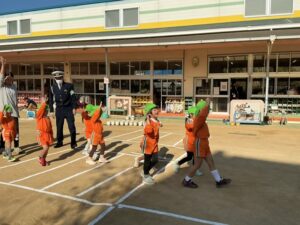 その後、園庭でミニ信号機を使って横断歩道を渡る練習をしました。