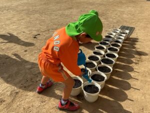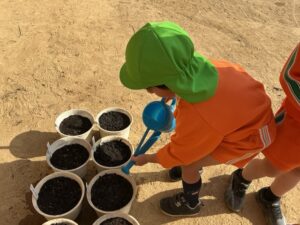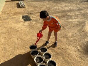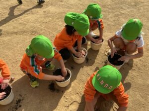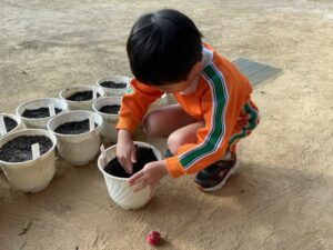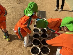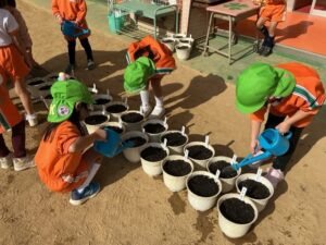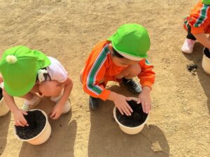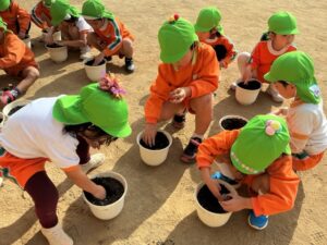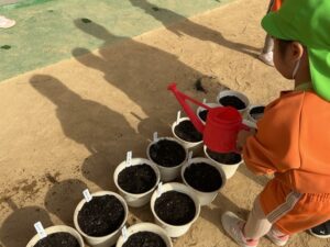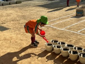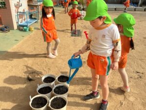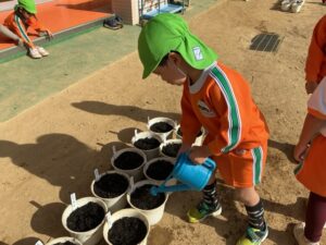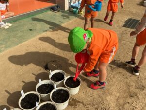 鉢の真ん中に穴を掘り、そこに球根を植えて、ソーッと土をかぶせます。