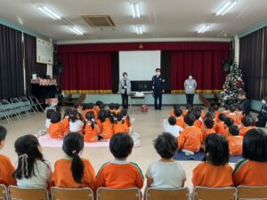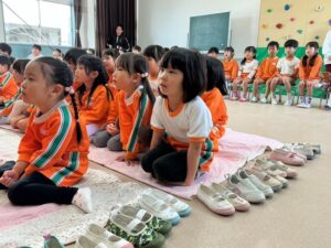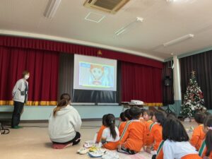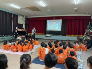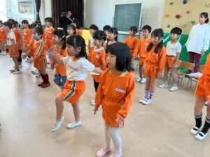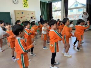 ホールで駐車場のお約束についてのDVDを見て、「できるにゃん体操」を踊りました。