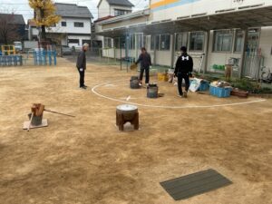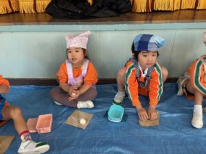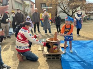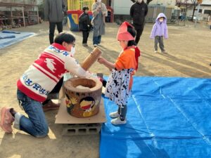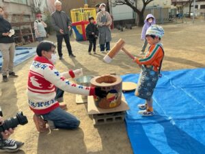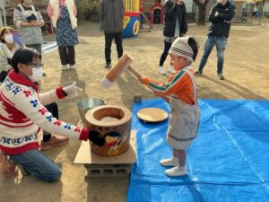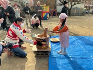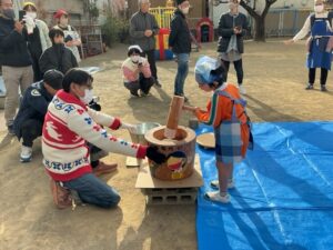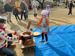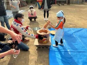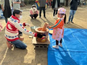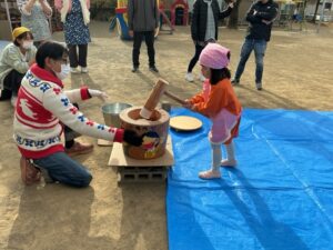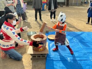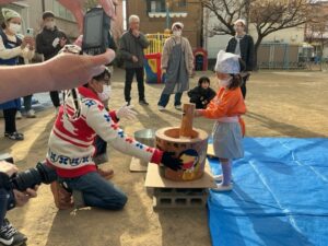 一人ずつ杵を持って『ぺったんこ』と頑張ってお餅をつきました。