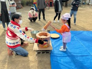 登園してきた子ども達は、園庭にある『おくど』や『おかま』、『杵』や『臼』を見て、雰囲気を感じたようでした。
