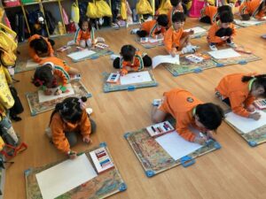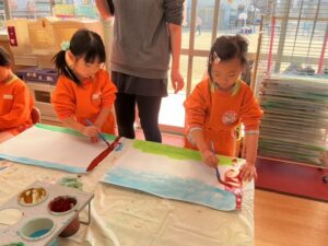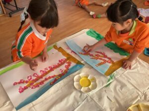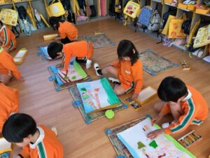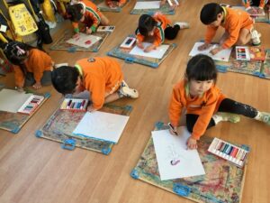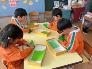 梅の花の絵の具の色や、ウグイスの折り紙の色を自分で選び、素敵な作品が出来上がりました!