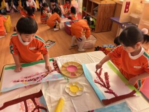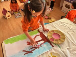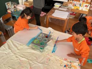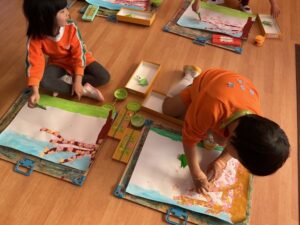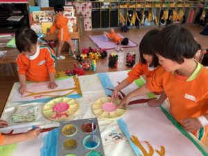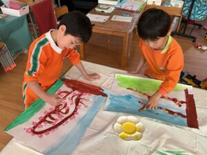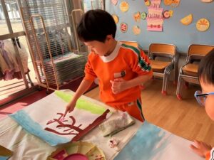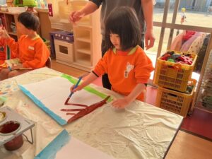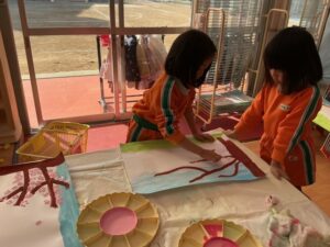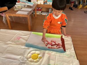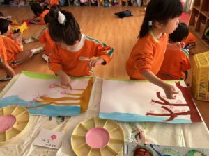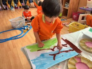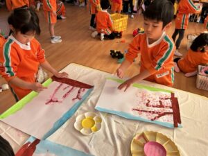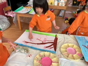 梅の花は、絵の具で描いた枝に、指先に絵の具をつけて花にしました。