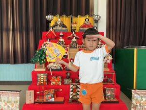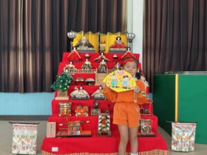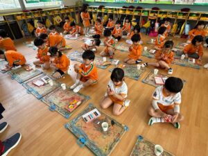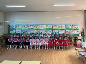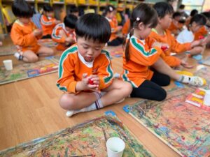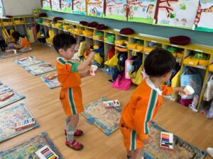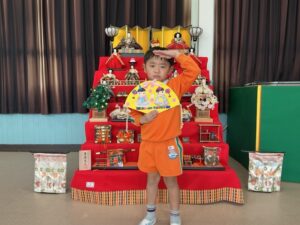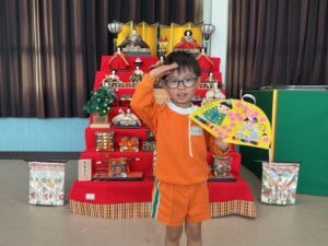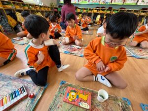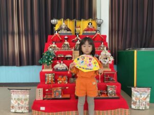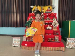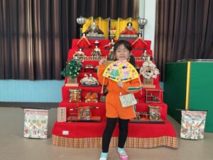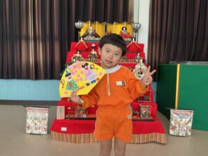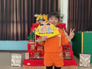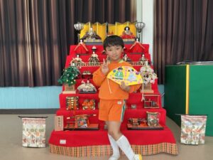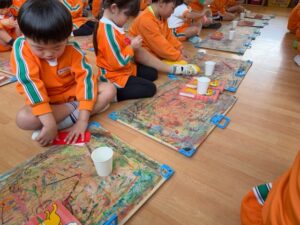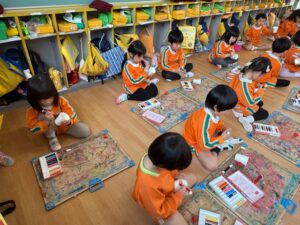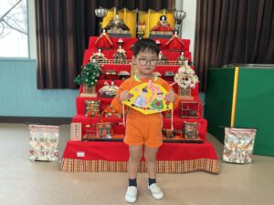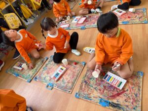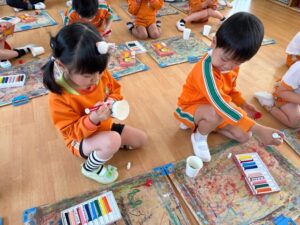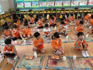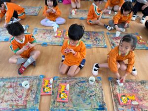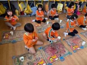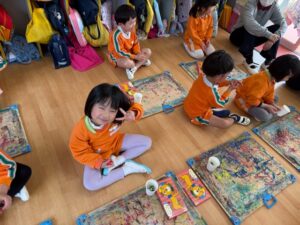 ไป้ฑใฎ้ ๅฝขๆๅฎคใงใฏใโใใกใ็ฉใโใจใใฆใ็ดใณใใใซใคใใดใๆใใฆใ่ตคใๆใ็ดใไธธใใใใฎใ็ทใฎๆฏ็ณธใง็นใใฆใ็ดใณใใใฎใใ็ใไฝใใพใใใ